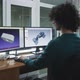 Young man in casual clothes with curly hair creating 3D model on computer while sitting at desk in modern design studio