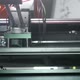 uper close focus on micro 3d printer head at work, printing small details with white filament, quickly moving inside glass box, futuristic shot. Industrial business concept, front view