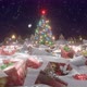 3d render VJ loop. Christmas tree decorated with gift boxes and candies. Christmas and New Year party or decoration idea. Seamless loop. Stars on the sky.