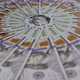 A close-up of many hundred-dollar bills lie in an even circle and slowly rotate, with Franklin’s face in the center.