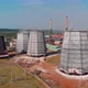 A drone flies over an industrial area. Cooling towers for cooling steam and water. Metallurgical enterprises in the aluminum production industry.