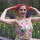 Awesome girl with rainbow braids and expressive glitter makeup. She sits and enjoys the warm spring weather in a green park with large tulip beds. UHD 4K 4x slow-motion video
