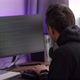 A hacker in a hood types program code. Young man criminal wearing black hoodie, typing on keyboard. Hacker attack.