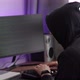 A hacker in a hood types program code. Young man criminal wearing black hoodie, typing on keyboard. Hacker attack.