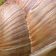 A macro close up shot of a snail shell then sliding right to the head of the snail with glistening moist skin and stalk eyes as it searches for food in the forest.