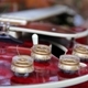 A striped snail eats green, juicy grass. The ant sits right there on her head.