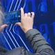 A woman shoots a video on a smartphone symbols in the form of a binary code on a blue background, futuristic symbols are inspired by the concept of a digital future.