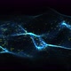 Abstract digital blue color wave with flowing small particles dance motion on wave and light abstract background. Cyber or technology background.