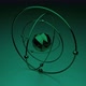 Abstract visualization of an atom model. Design. Motion graphics of electrons in an abstract malachite color glossy model of the atom on gradient dark green background
