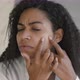 Acne problem. Young unhappy african american woman squeezing pimple on her cheek, looking at mirror at home, slow motion