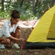 Active rest. Young positive african american woman tourist setting up tent, enjoying camping rest in non urban forest, slow motion, free space