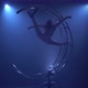Aerial acrobatics girl in a brilliant stage costume weighs in a twine on the construction in the form of a month and she spins. Blue smoke background