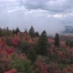 Aerial view flying over trees on hillside showing colorful trees, clouds, city, and mountains in the distance.