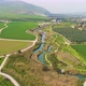Aerial view of cultivated fields with hills in the background and Kibbutzim Stream, Nir David, Northern District, Israel.