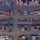 Aerial view of trucks unloading at the port container terminal. Bird’s eye view of the port cargo area with containers, bulk cargo, cranes, trucks and forklifts.