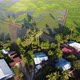 Aerial view shadow of coconut tree at the paddy field in morning sun light