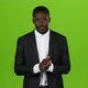 Businessman african american claps his hands loudly and shows his thumbs up, he is happy. Green screen