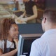 African waitress taking order of customer at bar counter typing on computer with smile. Man client ordering food on small cafe. Cafe restaurant service, concept, small business owner concept.