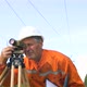 aged geodesist looks through dumpy level binocular and makes notes under high-tension power lines against trees closeup