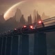 A levitating alien train sweeps across an unknown beautiful planet. Animation for fiction, futuristic or space travel backgrounds.