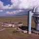 The Assy-Turgen Observatory with a large telescope. A tent camp is located nearby. There are colored tents, cars and people are resting. Big clouds over green hills. Two domes for studying the stars