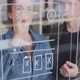 Tilt up shot of young businesswoman drawing UI ideas for new app on window or glass wall in office and talking to male colleague