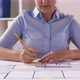 Architecture, building and construction concept – female architect with drawing compass and ruler measuring living house blueprint and taking notes.