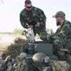 Army commander sits behind computer in field and creates reports to be sent to army base man approaches him and shows map they discuss agree on details in background soldiers guarding camp