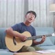 Asian Boy Composer With Notebook On Table Singing And Playing Guitar At Home