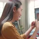 Asian Female Mobile Application Developer Works And Using Mobile Phone With Graphics On Her Personal Computer In Office