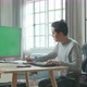 Asian Man In Long Sleeved T-Shirt Looking At Green Screen Desktop Computer And Writing In Notebook On A Table While Working At Home.