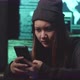 Young Asian Woman Hacker Using Mobile Phone During Hacking Computer, Code On Multiple Computer Screens
