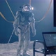Medium shot of an astronaut and scientists testing mobility of a spacesuit