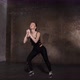 Athlete performs exercises from the group program with dumbbells. Dark loft hall
