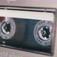 Audio Cassette is inserted into the Deck of the Audio Tape Recorder Playing and Rotates. Macro. Vintage transparent audio cassette tape with a blank label used for sound recording in a retro cassette player. Close-up.