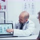 Young male doctor explaining how to avoiding bones problems to elderly retired old woman. Radiology and radiography in modern private hospital or clinic with medical staff walking in background, nurse working, healthcare system.