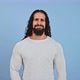 Bad idea. Displeased young man man listening to camera, showing facepalm gesture and shaking head as rejection, blue studio background