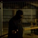 A man dressed in dark clothes and a balaclava goes with a bat in an abandoned park. There is an early winter outside and garlands hang around. His face is not visible in backlight. He is set up to fight or robbery.