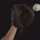 Close up of the raised hand of a Caucasian male baseball pitcher or fielder, catching a baseball in his mitt, slow motion