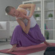 Lady consulting digital tablet to perform sequence upward facing dog – downward facing dog – revolved side angle pose