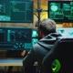 Bearded hacker turning and looking into the camera while breaking a firewall.