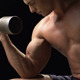 Close up of man with bare torso lifting up dumbbell