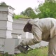 The beekeeper man is visiting the hives by inspecting the hives.