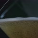 Macro shot frothy foam on top of beer which is produced by bubbles rising to the surface on the black background