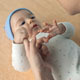 Close up of newborn baby lying on his back and stretching his arms to mommy
