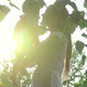 Dolly of young woman standing in the woods and holding her daughter tenderly