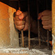 A person is clinging with both hands to the iron bars of the window of a prison cell, in a gesture of desperate need for freedom.