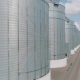 Aerial view of Steel grain wheat silos elevators storage on a cloudy spring day. Agriculture industry, manufacturing plant.