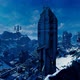 The infrastructure of a space base with large buildings located in the gorge of large mountains