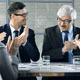 Dolly of business team of six sitting at the table and congratulating themselves with applause